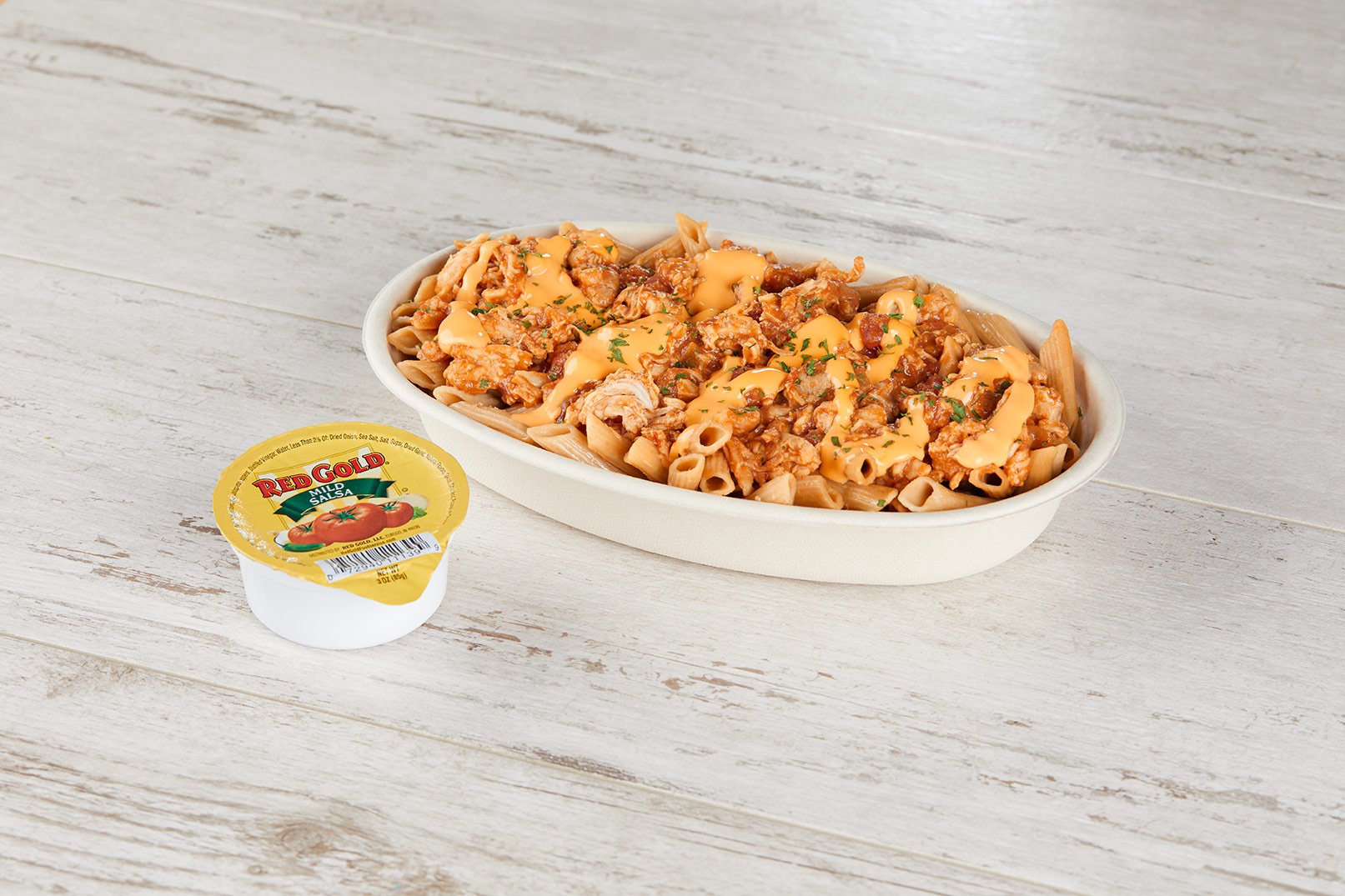 chicken mixture. (Add a little more, if needed, to keep pasta from drying out.) Top with 1-ounce ladle hot
