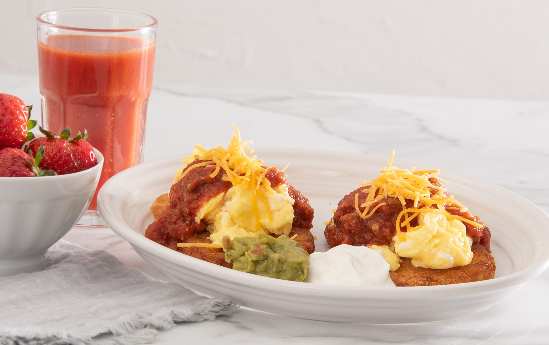 A quick, craveable breakfast build with crispy hash browns, scrambled eggs, and taco‑seasoned salsa topped with melted cheddar. Easy assembly, big flavor.