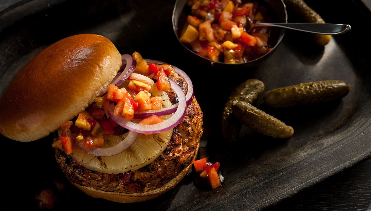 Tropical flavors shine in this vibrant chicken burger, which combines Caribbean seasonings with a sweet-and-savory tomato topping.