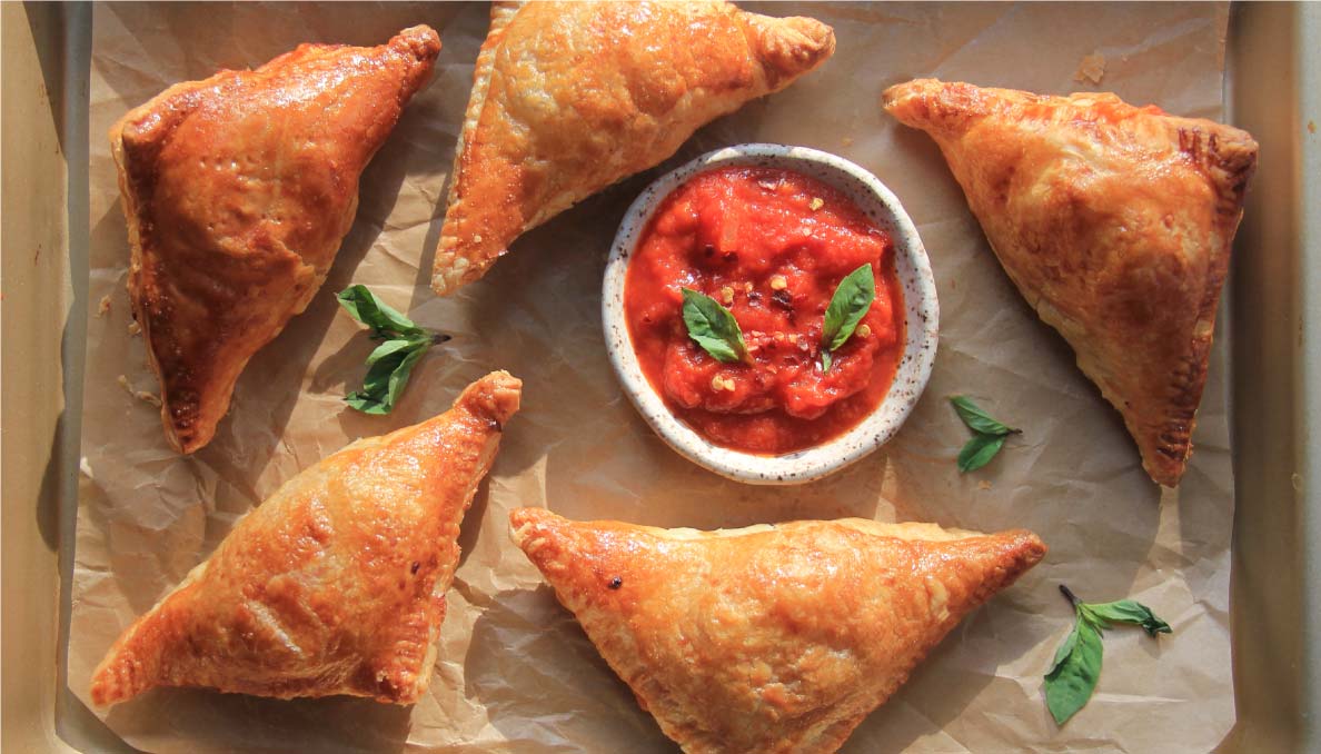 Flaky puff pastry pockets filled with chicken parmesan goodness make these elegant, bite-sized appetizers a hit at any event.