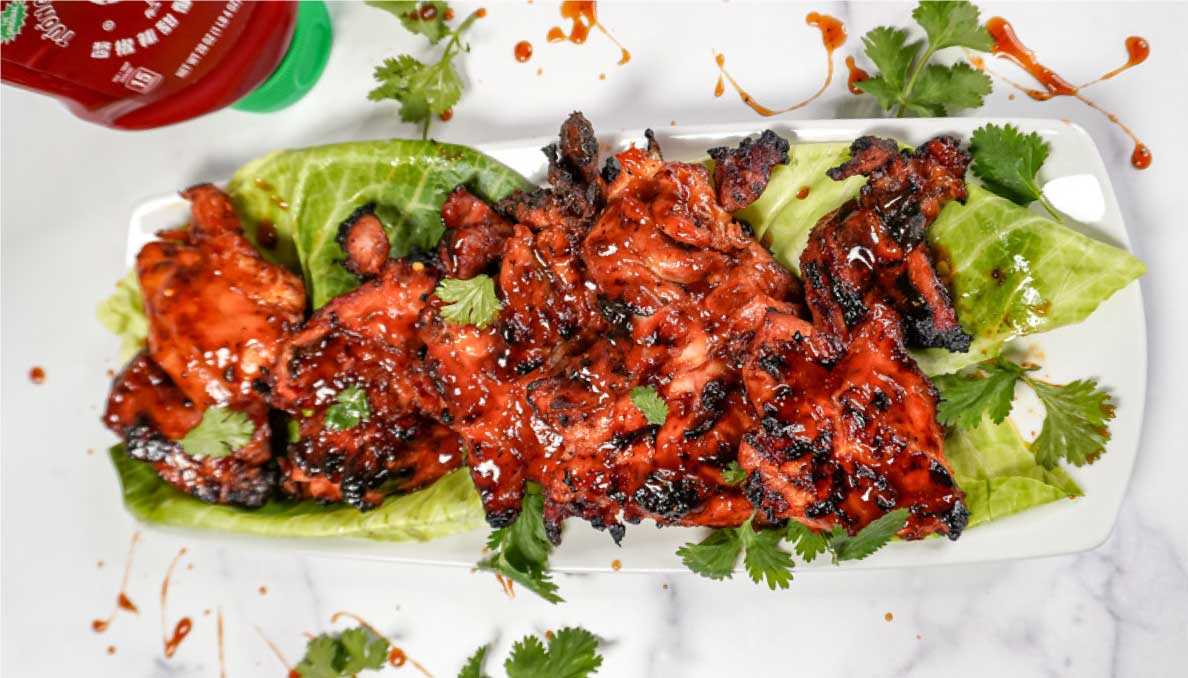 These juicy grilled chicken thighs are coated in a tomato-based glaze with the perfect sweet and spicy balance.