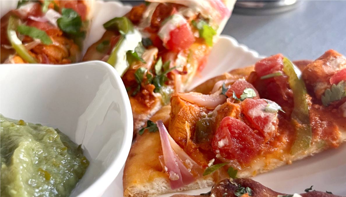 This flatbread features spiced tandoori chicken and a tomato-based topping for a fusion-style meal.
