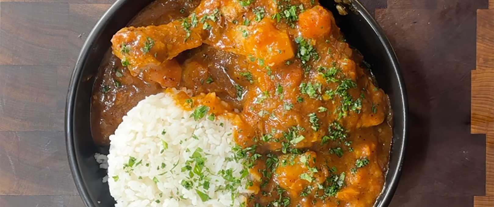 Return the chicken leg quarters to the pan, nestling them into the sauce. Cover and reduce the heat to medium-low. Simmer for 20 minutes. Add the potatoes and cook for another 20 to 25 minutes, until the potatoes are fork-tender and the chicken reaches an internal temperature of 165°F. For a thicker sauce, uncover the pan and simmer for 5 to 10 minutes more. You can also stir in a corn starch slurry if desired.