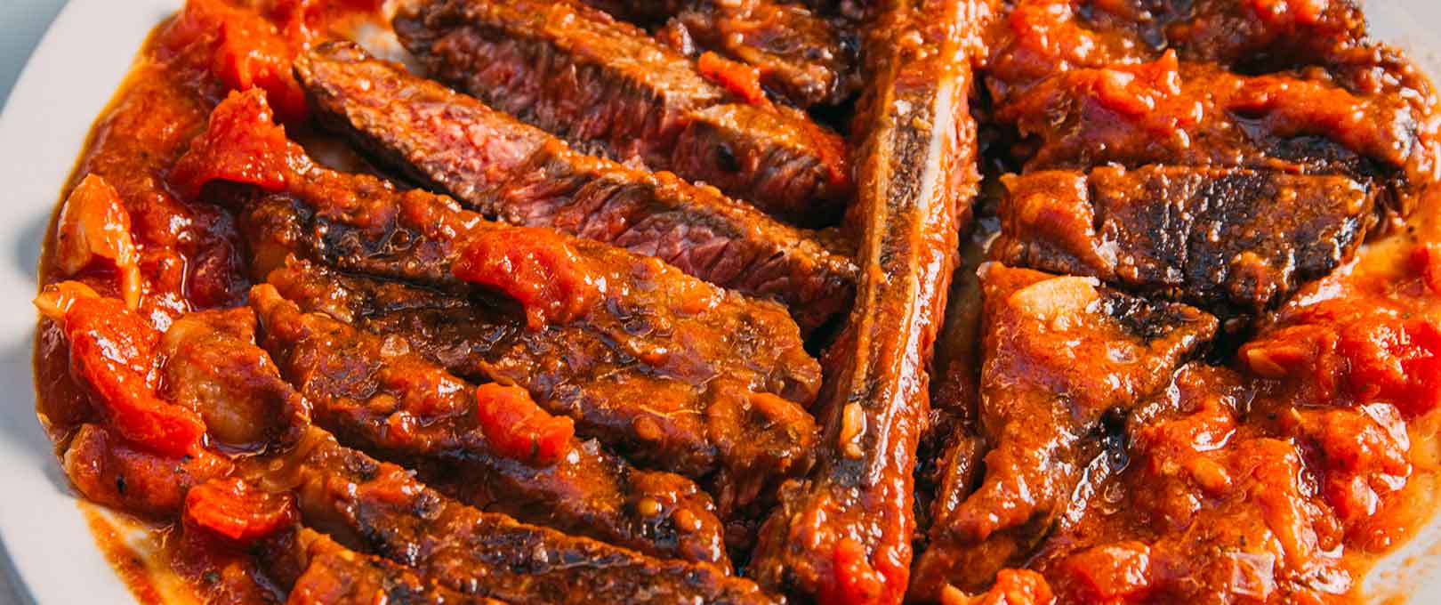 Bistecca is Tuscan steak, known in America as the T-bone steak. This steak is pan seared in a hot skillet for a brown crust, then basted with our simple Marinara Sauce for a steak that will melt in your mouth.