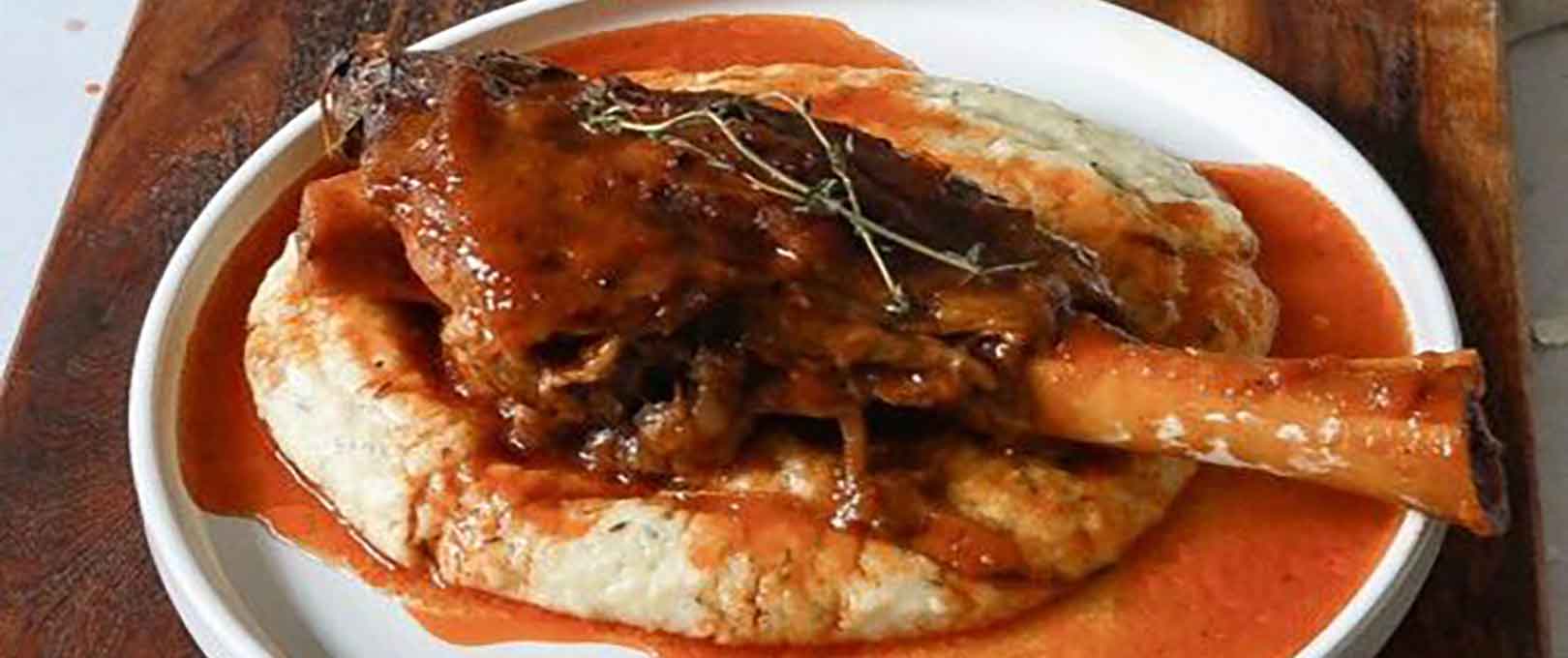 Serve the braised lamb shanks over a bed of creamy mashed potatoes, spooning the rich braising liquid over the top.