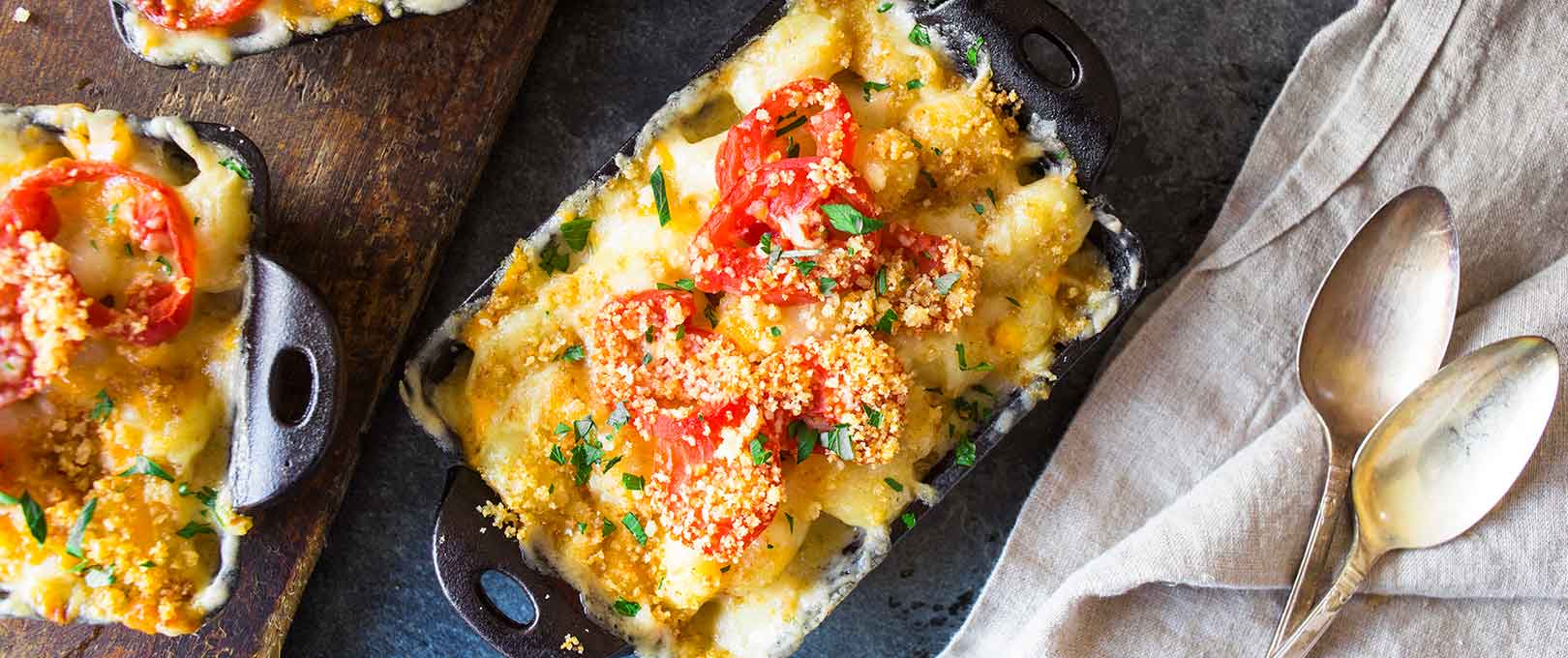 Gnocchi replaces macaroni for an Italian twist on a family favorite. Our version uses three types of cheese; Gruyere, Fontina, Cheddar, and is topped with crunchy panko and Parmesan and sliced tomatoes. Sure to become your new favorite comfort dish.