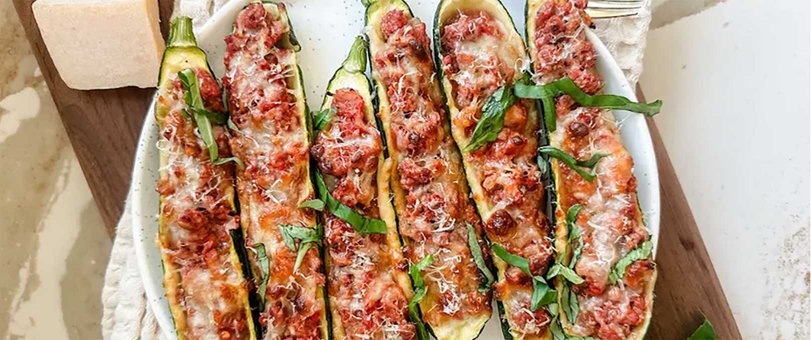 Spoon a layer of the meat sauce into each zucchini boat. Top with mozzarella and Parmesan cheese.
