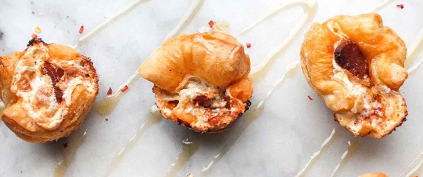 Spray tin with non-stick oil and add your pastry squares. Add in about a teaspoon of marinara to each cup, followed by grated mozzarella and your soppressata or pepperoni. (Note: make sure to not add too much filling to the tartlets as they will rise and can get messy.)